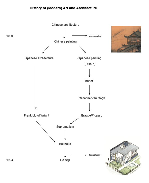 De Stijl co-founder Theo Van Doesburg, who popularized axonometry in the West, understood the implications of the Eastern role in the modernist revolution on yet another level. In his paper The New Style in Art (1916), Van Doesburg referred to the “immateriality” of modern art, writing:
