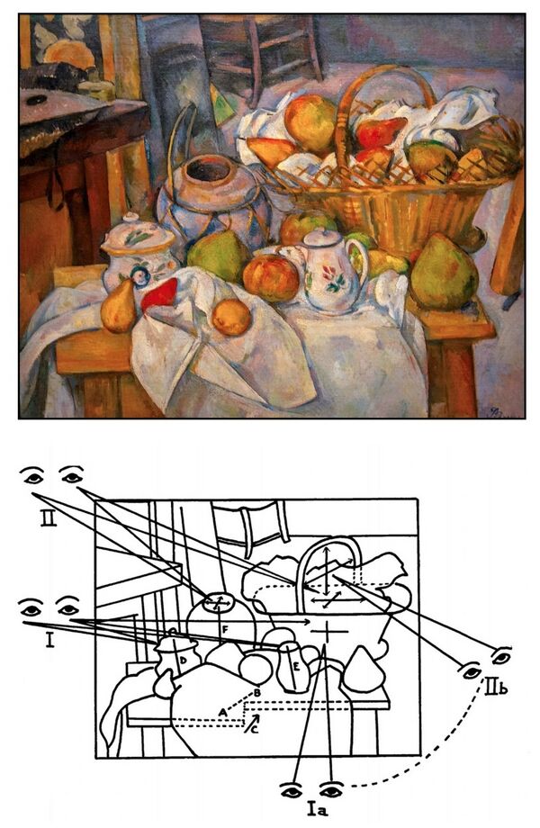 Cezanne went a step further in his deconstruction of linear perspective. In his Still Life with Basket, he brought objects in the background forward to the picture plane by making them larger. Moreover, he depicted the objects in the painting as if seen from different vantage points. A diagram by art historian Erle Loran shows that Cezanne integrated multiple vantage points in a single image.