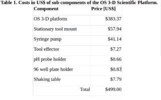 - Chenlong Zhang, Bas Wijnen, Joshua M. Pearce. Open-source 3-D Platform for Low-cost Scientific Instrument Ecosystem. Journal of Laboratory Automation 21(4) 517-525 (2016). DOI: http://dx.doi.org/10.1177/2211068215624406 open access
