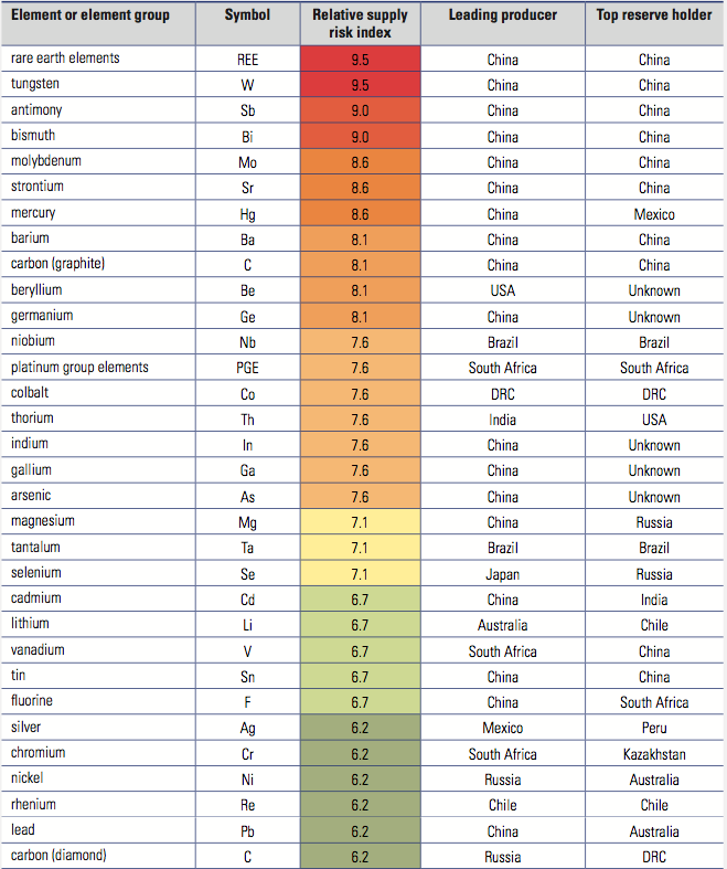 The BGS states “The...list provides a quick and simple indication of the relative risk in 2012 to the supply of...elements or element groups that we need to maintain our economy and lifestyle. The position of an element on this list is determined by a number of factors that might affect availability. These include the natural abundance of elements in the Earth’s crust, the location of current production and reserves, and the political stability of those locations...recycling rates and substitutability of the elements has been considered in the analysis.”<ref name="ftn727">Ibid.</ref>
