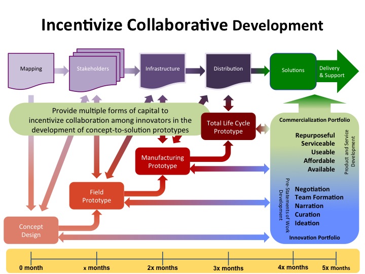 Since stakeholders are the ones who possess these sources of capital, engagement with them serves a dual purpose. First, they use their human and social capital to build the maps of ecosystems - complete with documentation of infrastructure and distribution pathways - in which concepts develop into solutions. Second, they invest the full range and degree of capital, be it human, social, built, natural, and financial, critical for the solutions to travel these pathways to successful delivery in the market. If appropriately incentivized, stakeholders will take advantage of opportunities to join teams that advance preliminary statements of work or they can advocate on behalf of the preliminary statements of work during negotiations with potential sponsors and funders or they can invest directly in solution development.