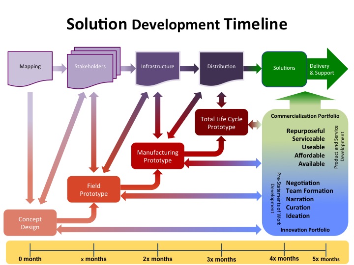 An idea / concept often takes an erratic and unpredictable, but steady course on its way to become a viable solution in the market. Figure 4 below lays an idealized timeline along the bottom as a general reference. A rule of thumb one can apply is that the time it takes to successfully complete the Field Prototype stage, "x", in other words, will become a standard factor in each subsequent stage. Do it well and the formula will hold up. Not so well, and the difficulty will only multiply later on.