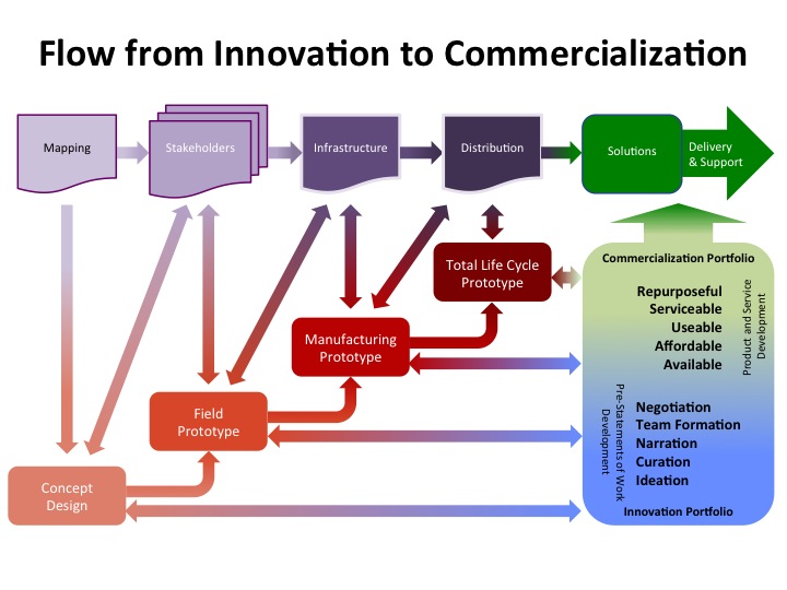 Development of solutions within particular contexts is a complex exercise, as the double-headed arrows suggest in the diagrams above. However, this complexity can be managed to some degree when one builds the case for a proposed idea / concept through a logical, step-by-step process that results in a tangible solution with market value as determined by its availability, affordability, usability, serviceability, and end-of-life sustainability. Figure 3 below introduces two, interconnected portfolios, one for innovation and the other for commercialization, that capture the activities associated with developing and delivering solutions.
