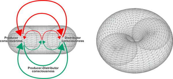 This two torus share the same reflection point. In the inside torus people evolve their consciousness and in the outer torus people make actions that affect the environment. And the environment influences the inside torus too. Always in a closed evolution cycle.