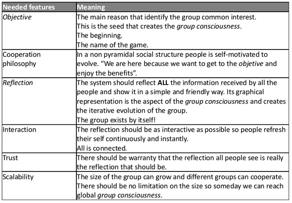 I define group consciousness as a transformation element of the people that form the cooperation group. The more group consciousness more evolution of the group. The name refers to its meaning [15] but if you feel uncomfortable with this definition you can take it as an arbitrary name by now.