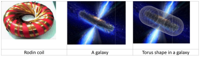 Marco Rodin has defined Vortex Based Math[24] in the 90' like “the way energy flows” and it is based in the torus geometry. This is very important. He created a coil called Rodin's coil that is extremely efficient and its shape is a torus. This new mathematic is being formalized now by his disciple Randy Powel[23] and promise that free energy engines are possible when their magnetic fields is a torus. In the cosmos, black holes are also described by a torus geometry.