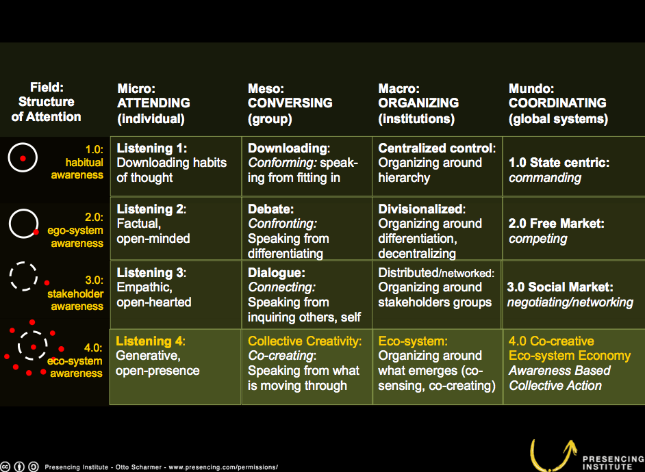 Many people think that what’s missing in order to move to a new economy is just a set of better ideas. That, of course, is not the case. We need much more than new ideas. We need new innovation structures and social technologies that will allow groups to move from their habitual levels to the new co-create level 4.