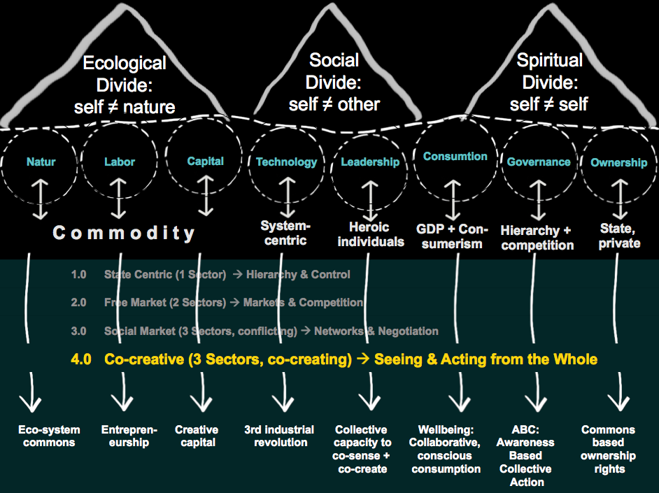 We’re wasting our resources by trying to solve 4.0 (eco-system) problems with 2.0 or 3.0 response patterns. And by debating whether our response should be shaped by 2.0 or 3.0 mechanisms, we are wasting our public conversation with false alternatives. The real questions that we should be asking are: How do we advance our economic thought and action to 4.0? How do we construct pioneering pathways into the co-creative eco-system economy?