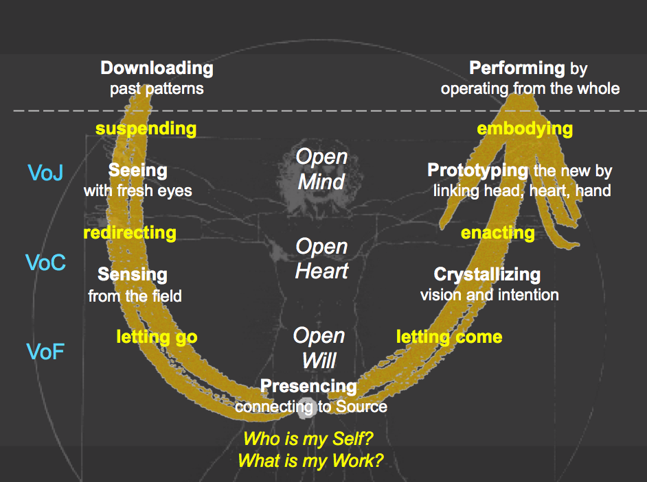 - Leadership: Close the feedback loop from leadership to the emerging future of the whole through practices of co-sensing, co-inspiring, and co-creating.