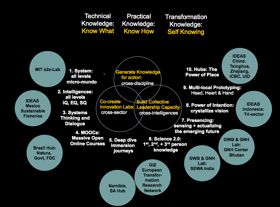 - Power of Place: Complement the massive expansion of online learning with an equally massive global network of vibrant entrepreneurial hubs that focus on activating co-sensing and co-creating as a gateway for unleashing entrepreneurial potential. Great innovations happen in places. Learning how to design and hold spaces for reflection, generative conversation, and system-wide transformation is a mission critical capacity today.