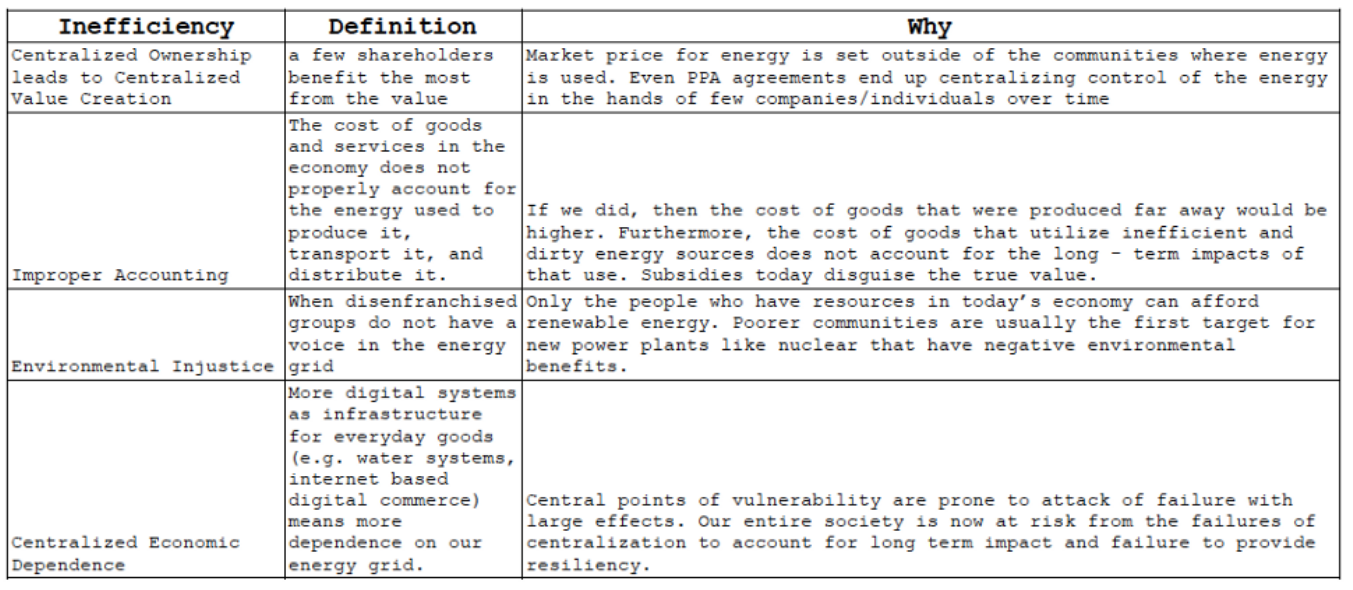 In the current system, physical power is centralized in power plants where energy is produced far away from where it is consumed. Economic power is centralized in the hands of too few investors and grid operators who decide what kind of power is produced and the cost of it. For specific examples and case studies that explain these problems, see the grids at the end.
