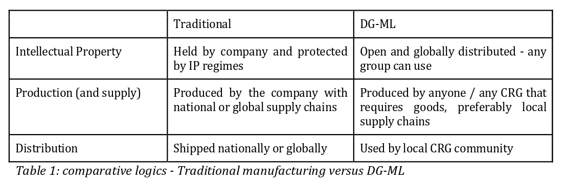 "The basic features of DG-ML are based on the conjunction of open source / open design production logics at the global scale, which are coupled with local-network production at a regional scale. Traditionally corporate enterprises have solely owned the intellectual property (IP) they employ in the production of goods. They source the materials for the goods through national or global supply chains. They manufacture those goods using economies of scale in a set number of manufacturing centres, whereupon those finished goods are delivered nationally or globally. DG-ML is an inversion of this production logic. First of all, the IP is open, whether open source or creative commons or copyfair, so it can be used by anyone. Secondly, manufacturing and production can be done independently of the IP, by any community or enterprise around the world that wants to. The democratization of increasingly powerful precision manufacturing technologies, such as 3D printers, laser cutters, CNC routers and automated systems / robots potentiate this. This does not follow the logic of economies of scale (yet), rather it is focused on producing value for a critical reference group (CRG), a community who require such goods. Thirdly, distribution is localized to the CRG, or affiliates of the CRG." (https://www.academia.edu/33661849/A_New_Model_of_Production_for_a_New_Economy)