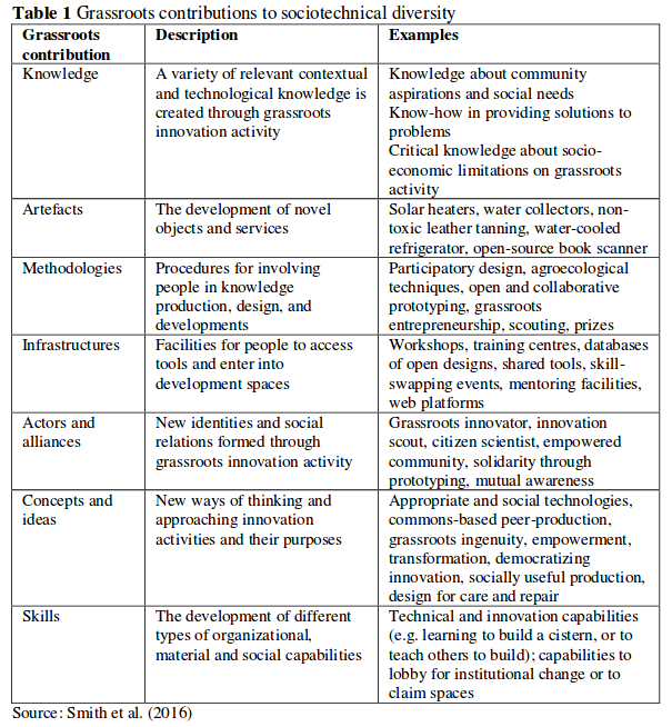 "Grassroots innovation is a diverse set of activities in which networks of neighbors, community groups, and activists work with people to generate bottom-up solutions for sustainable developments; novel solutions that respond to the local situation and the interests and values of the communities involved; and where those communities have control over the process and outcomes (Gupta et al., 2003; Seyfang & Smith, 2007).