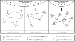 The main vein of our critique to resilient communities, as stated in Section 2, is twofold. First, many resilient communities and eco-villages are producing a design/knowledge commons while working to meet their needs, but because of their local focus: they have loose connections with each other; they do not produce a global commons; and thus they fail to contribute to the formation of a global counter-power. Second, a radical shift should take place toward contraction and downscaling, whereas we claim that there are possibilities for “doing things differently” utilizing the modern community-driven technologies and practices. In line with degrowth and resilient communities narratives, we are arguably living the endgame of neoliberal material globalization based on cheap energy, which necessitates relocalization of production. However, we have new possibilities for online, affinity-based socialization, coupled with the resulting physical interactions and community building. The value-creation communities of the global commons approach might be locally based but are globally linked. Out of that, there may come new forms of business organization, which are substantially more community- oriented. This approach sees no contradiction between global open design collaboration, and local production/ manufacturing: both can occur simultaneously, so the relocalized reterritorialization will be accompanied by global networks of enterprises. The various information commons, based on shared knowledge, code and design, will be part of these new global knowledge networks, but closely linked to relocalized implementations.