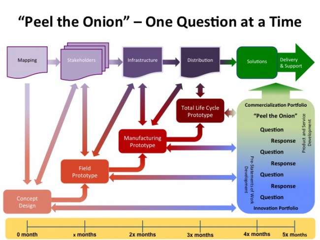 In many respects this step by step approach is summarized by the longstanding riddle, “How does one eat an elephant?” The answer, of course, is “One bite at a time!” Or one could consider discovering the path for an idea to become a solution as an onion which gets peeled one layer at a time in order to better absorb what one has learned thus far before going deeper, asking the next question, and taking the next step.